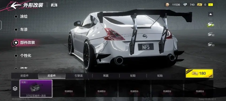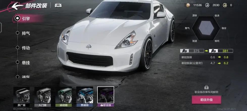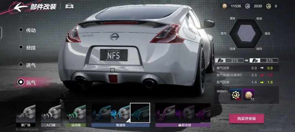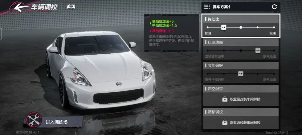 在这边我们举个例子:比如下图这辆日产370z赛车的独有特性是“消耗氮气之后恢复少量集气”,那么我们根据这个特性可以减少赛车自身集气辆的需求,在氮气分支选择更高氮气极速和加速的部件。同时在实时调教中可以选择减少集气量而获取更大的氮气极速,这样可以拉高整台赛车的性能同时,在比赛中也能够拥有够用的集气量。