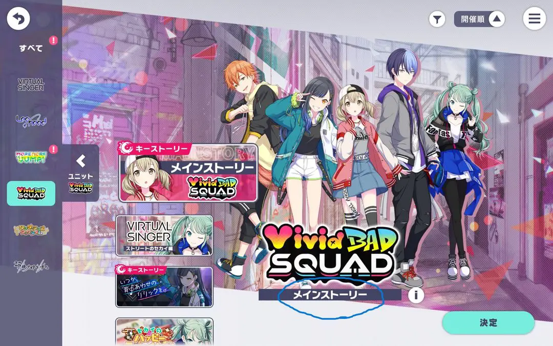 前5个完成方法很简单、进入MAINSTORY(主线剧情)、选择各个团,右上角改一下“開催順”,选择第一章(章节带有“メインストーリー”),每个团的第一章点进去,完成下图红色圈出来的部分。
