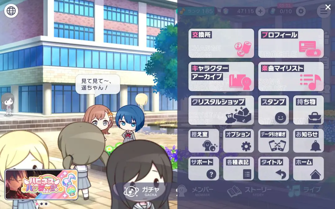 下方从左到右分别为:GACHA(抽卡)、MEMBER(人物)、STORY(剧情)、LIVE(打歌)