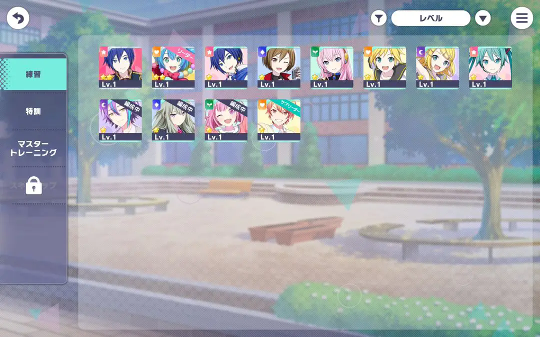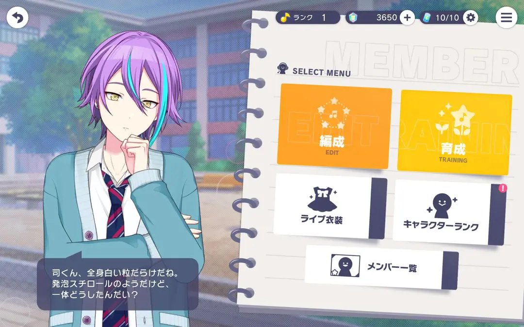 总体包括编成、育成、“ライブ衣装”【现场服装】、“キャラクターランワ”【角色等级】、“メンバー一覽”【会员名单】