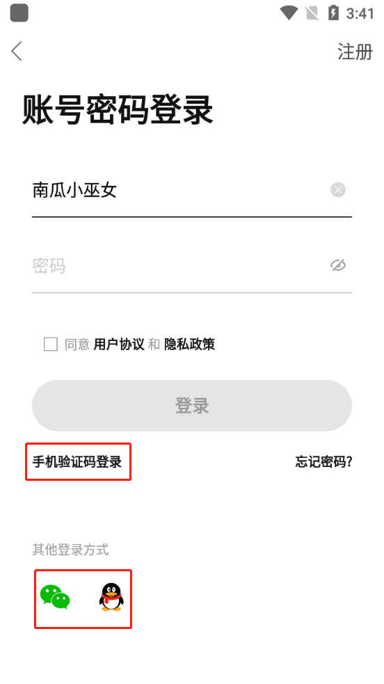 4、其他方式登录的话可以直接使用账号密码,手机验证码,还有qq登录进行登录。