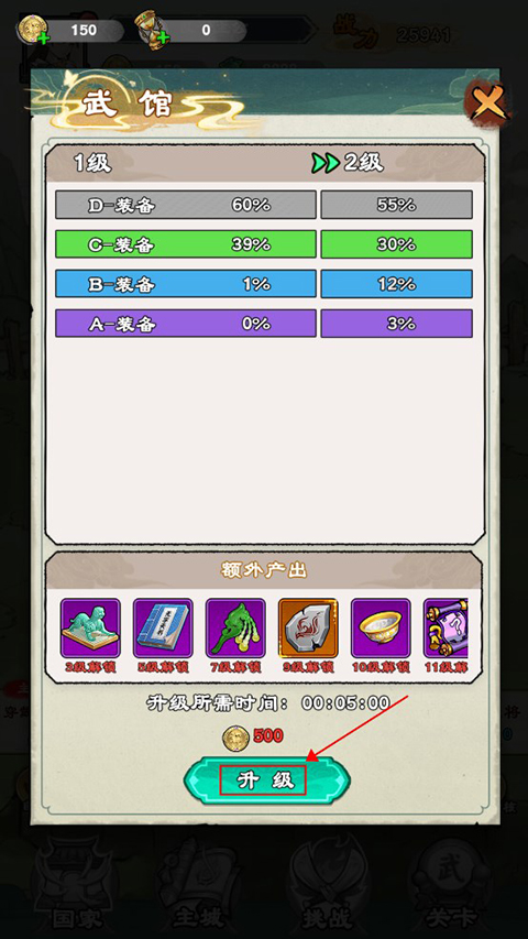6、升级需要时间,玩家可以进行关卡挑战来获取加速沙漏。
