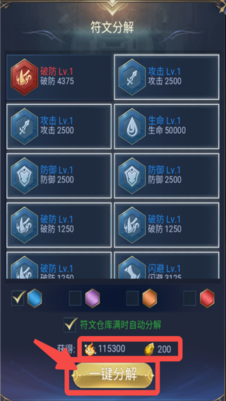 分解符文可以获得符文升级材料与兑换材料;这些材料可以用于升级符文等级、在符文兑换中兑换符文以及符文精华等。