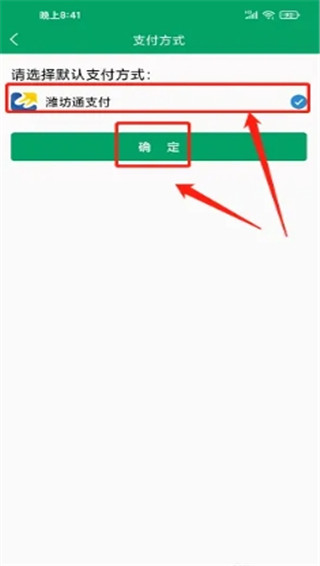 进入支付方式界面,勾选【潍坊通支付】,点击【确定】。