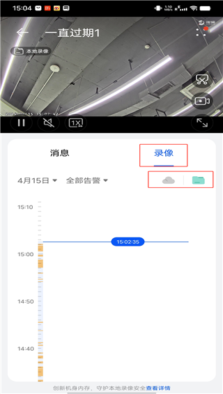 步骤4:点击录像,查看全天时间段录像。可点击图标,切换查看本地与云录像时间轴。