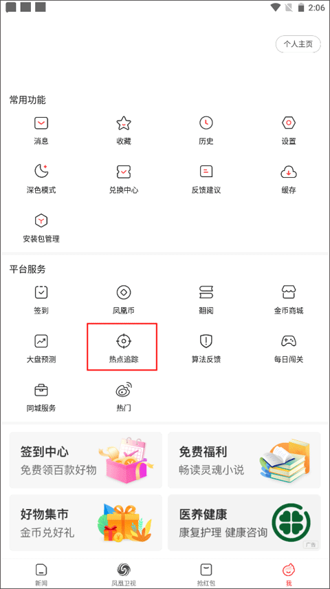 1、从首页切换到【我】界面,选择平台服务中的“热点追踪”;