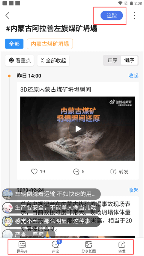 3、进入到新闻的详情页面之后,点击右上方的“追踪”按钮,你可以根据这件事发表自己的看法或见解;