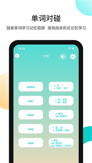 【单词对碰】提供独家的单词学习记忆视频、游戏闯关形式的记忆练习,让学生能够通过动画图像以及游戏化的训练方式更深刻地记住英语单词。