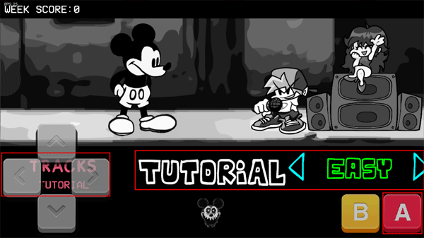 1、打开Sunday Night Suicide游戏,会看到一只灰色的米老鼠,点击屏幕进入到主界面。左边是上下左右方向键,右边是返回和确认键。通过点击上下键来选择中间的功能选项。