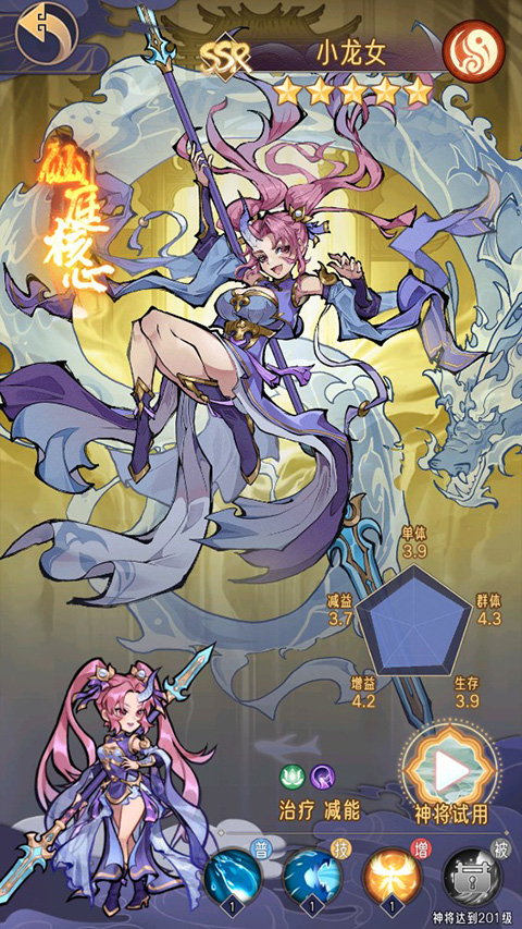 (4)小龙女:小龙女普通攻击可以增加能量,配合闻仲大招恢复能力,大大增强自身大招释放频率,可以2回合释放一次全体治疗及后排减伤盾,让队伍的奶量十足。