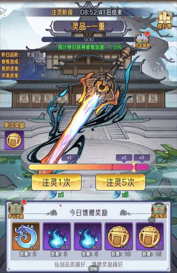 每日的仙剑注灵也是必须要完成的,每日宗派活跃达到25可以领取到5个注灵石,利用注灵石可以完成注灵,注灵可以获取仙玉,宗派真气,宗派贡献等奖励;还可以加速第二日修炼速度,以及翻牌抽奖。