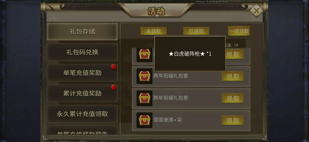 然后在第二关后将经验果全部给内购武将,切记一定要在第二关之后再给。然后领取跨年祝福的礼包,这样一来你就有两把二阶的白虎枪,一把等级高,一把等级低。