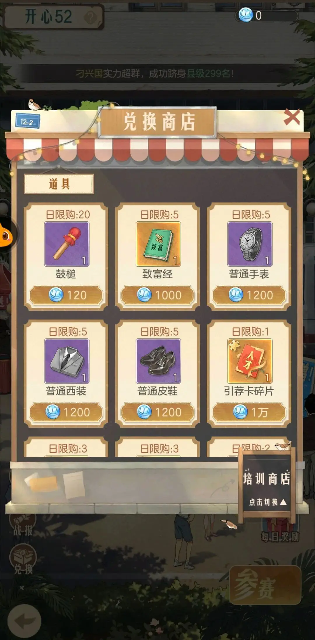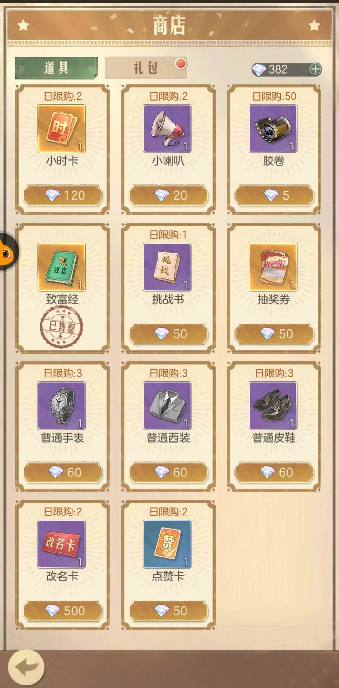 前期优先购买魅力道具、经验卡、人参、普通西装、普通皮鞋、普通手表、火车票(必买)(优先级推荐:1、火车票,2、魅力资源、3、人参、4、普通西装、普通皮鞋、普通手表、5、经验卡),其余视个人情况增加即可)