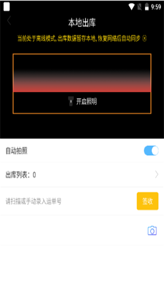 4、在本地出库页面,扫描识别单号就可以进行出库;