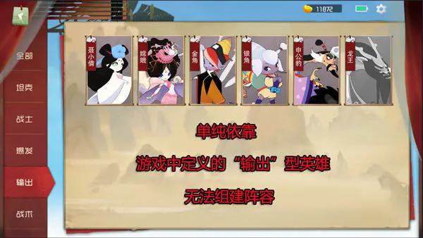 在游戏中有一些英雄被定义为“输出”型,但他们的定义与本文所提到的“输出”略有差异:细看之下不难发现游戏中被定义为“输出”型的英雄均是远攻角色,他们的攻击伤害呈持续性(欠缺爆发力),并且大部分都没啥自保能力,要是单用这六名英雄组建阵容肯定毫无对抗力!