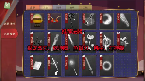 3、鱼骨刃——与火属性法宝相关的法器,由于部分英雄在施法过程中很容易受速度影响实际伤害量(例如小白龙、白骨精),依靠“鱼骨刃”的提速效果可以变相提升这类英雄的技能伤害。