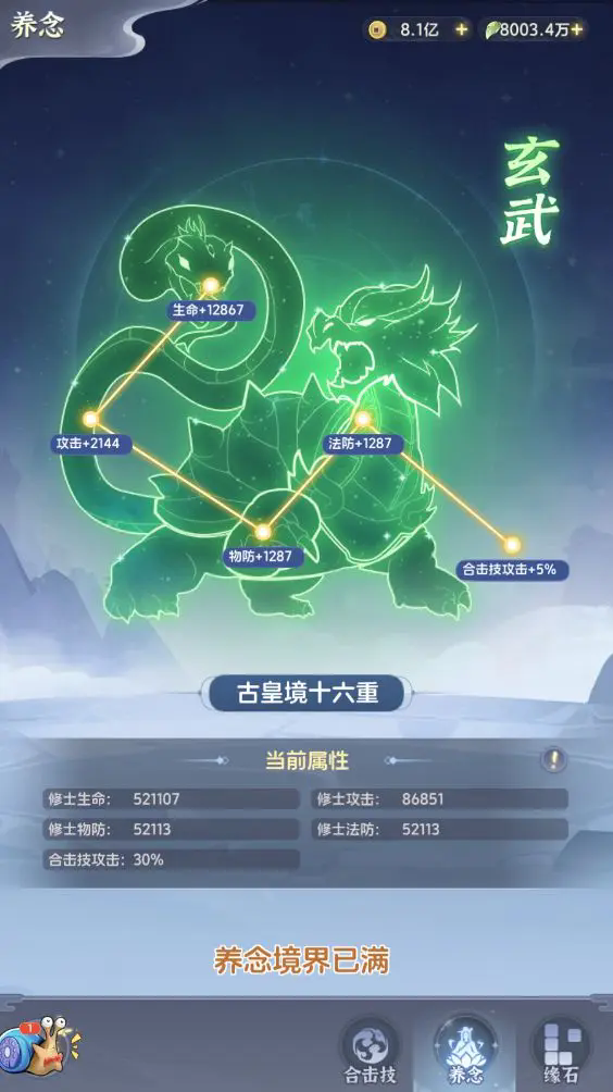 合击技不仅能在战斗中扭转乾坤,也能为上阵的修士提供士气,消耗念力点亮星图可提升境界增加属性。