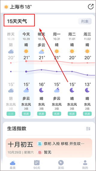 3、如你想详细查看某个日期的天气,你直接点击日期,即可进入该日期的详情气温,生活指数等信息。方便你更好的计划你在当地的穿着和出行方式。