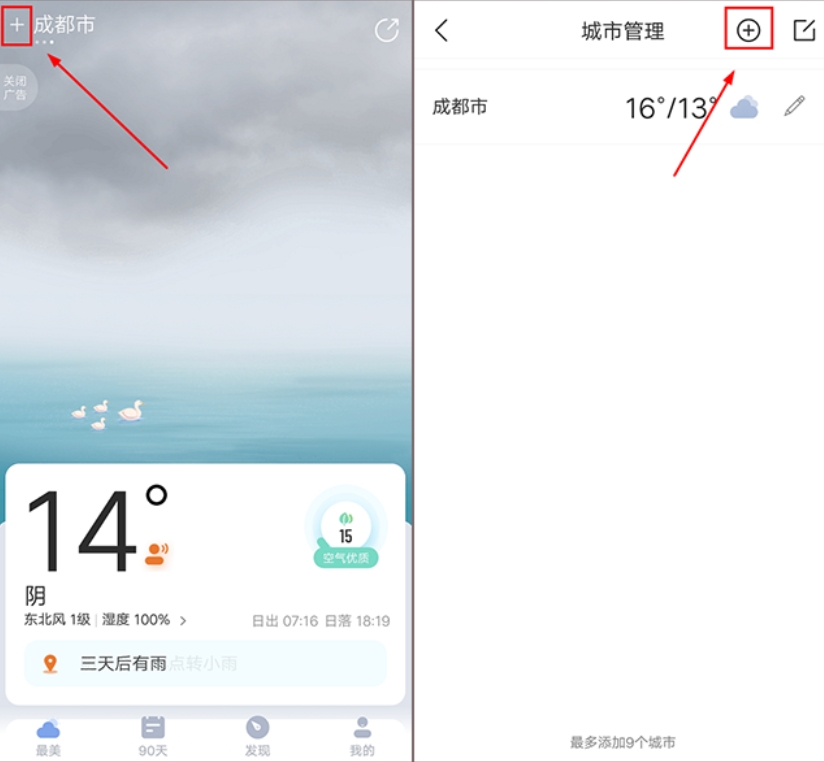 1、如你需要短期旅游,或是出差,你可登录打开app,点击上方【+】选择需要查询天气的城市;