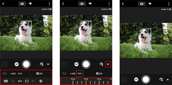 遥控拍摄的界面下方,会根据相机拍摄模式的不同,显示光圈值、快门速度、ISO感光度等,通过轻触屏幕便可直观进行拍摄设置。按下右侧三角形的拍摄设置按钮(中间图上红框部分),还可如右图隐藏拍摄设置,简化界面。