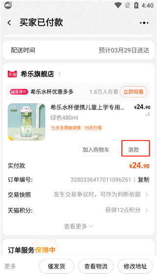 4、进入商品详情页面之后,点击商品右下方的【退款】;
