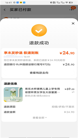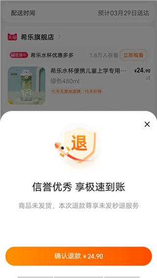 3、由于订单还没有发货,所以退款非常快,我们点击确认退款;