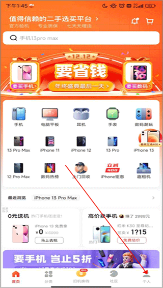 1、进入找靓机app,点击下方导航“个人”按钮。