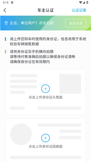 3、按照要求上传购车时使用的身份证,并点击提交认证即可