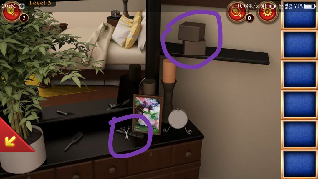 点击①处,得到梳妆台上的剪刀和盒子后面的胶水