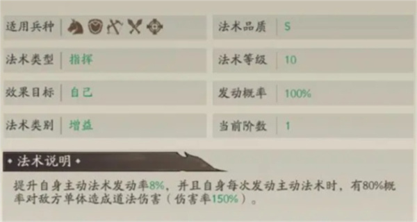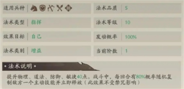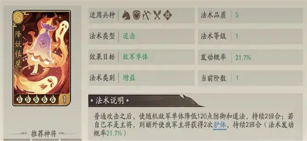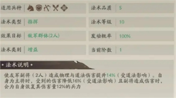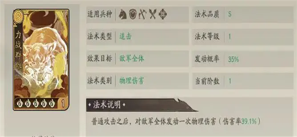 降妖镇魔:普攻之后,使随机敌军单体降低防御和道法,并额外使我军主将获得2次护体,攻防双端都有保证;力战群雄:普攻之后,对敌军全体发动一次物理伤害,大范围杀伤,削弱敌军整体战力。