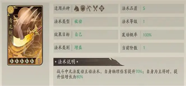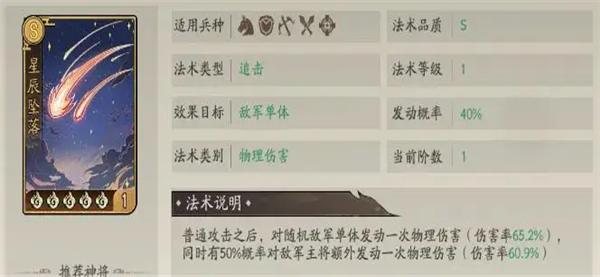 星辰坠落:普攻后对随机敌军单体造成一次物理伤害,并有概率对敌军主将额外发动一次物理伤害,增加伤害次数的同时,还能有万军中取上将首级的效果!