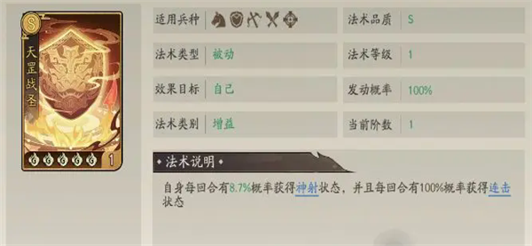 ● 法术备注:天罡战圣:每回合有概率获得神射状态(命中目标后无视闪避和护体效果),并且每回合有100%概率获得连击状态,可以普攻2次,增加了出手次数!