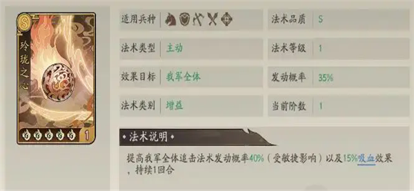 ● 搭配推荐:推荐阵法:诛仙剑阵-我军全体普攻时有概率对其他目标发起追击,额外造成物理伤害。