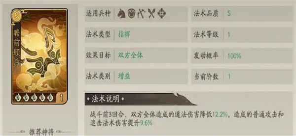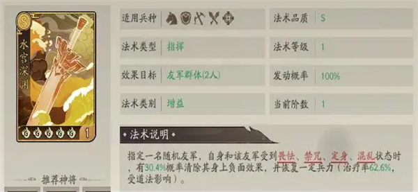 搭配【瞻前顾后】法术的前三回合降低双方道法伤害,提升普攻和追击法术伤害,加强输出神将的伤害力;再加上【水宫深渊】的清除友军的负面效果和治疗能力,为整体阵容的续航能力提供保障,这样完美的法术搭配,绝对是天才手笔!