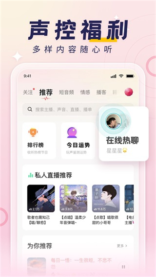 荔枝fm官方版是一款非常受欢迎的声音互动娱乐平台,涵盖了不同的版块内容,如奇闻异事,从业者,影娱,短剧,喜剧,有声书,情感,正能量,知识教育,睡前解压等,用户可以根据自己的喜好选择感兴趣的版块,同时,该应用还会推荐各种各样的榜单给用户,如人气榜,新星榜,付费榜等,点击即可收听,如果有感兴趣的声音,主播或者直播内容,可以直接使用搜索功能精准查找。