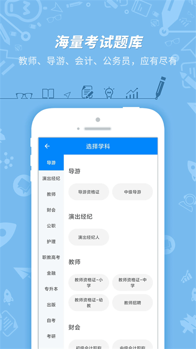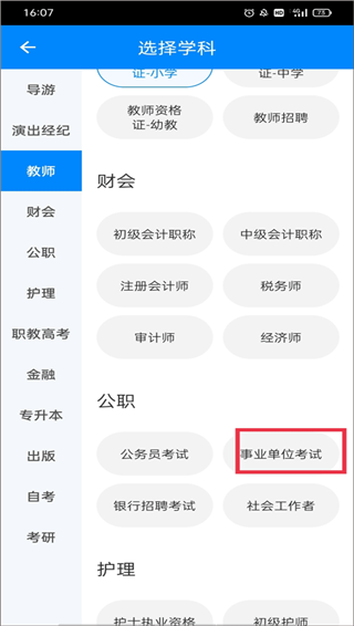2、左边有很多的学科可以选择,如导游、演出经纪、教师、财会等,右边就是具体的学科分类了。