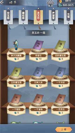 坊市被分为珍宝阁、藏经阁、灵玉坊、声望堂、黑市、充值等