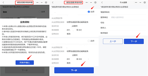 二、目前支持道路旅客运输、普通货物运输和危险货物运输驾驶员的诚信考核业务办理。用户在小程序完成注册登录和实名认证后,可通过本人身份证号自动关联本人已有从业资格信息。认真阅读诚信(信誉)考核业务须知后,您可以点击【同意并确认】,进入选择申请办理业务的从业资格证信息页面,确认本人道路运输从业资格证在有效期内且信息未发生变化,选择需要办理业务的从业资格证进入【下一步】完善个人信息。这里展示的个人信息是根据从业人员信息自动关联的。除了人员姓名以外,其余的信息都支持编辑修改,其中,“服务单位”需自行填写,有单位的填单位名称,没有的可填写个人。确认无误后,点击进入【下一步】。