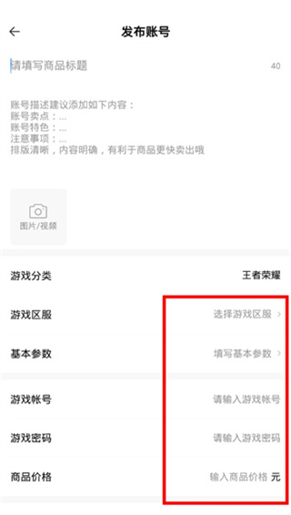 5、最后在发布商品页面中,填写基本的介绍以及游戏区服等等,进行发布即可。
