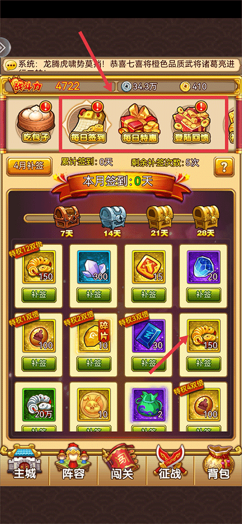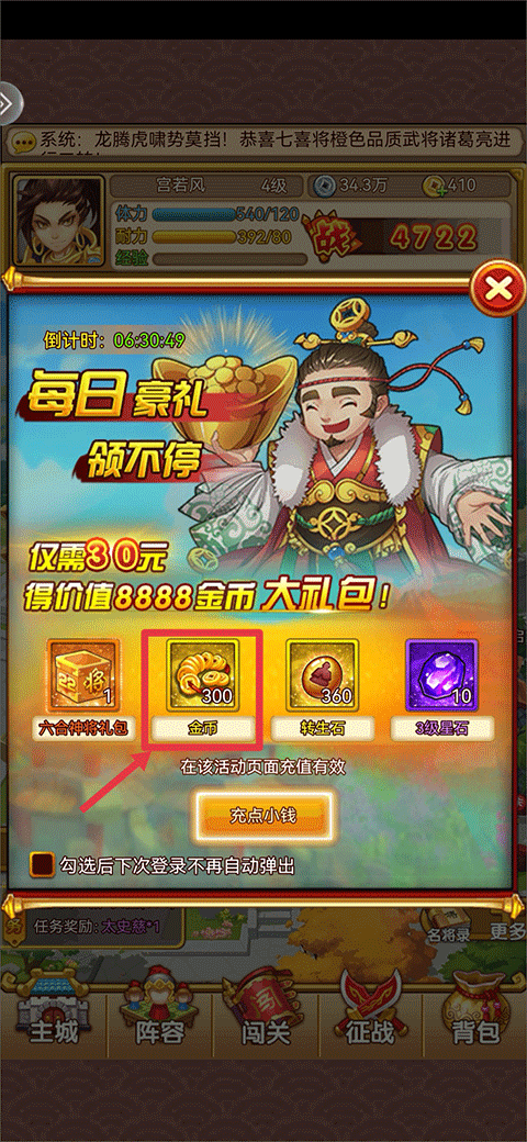 3、每日豪礼:玩家充值30元后即可在每日豪礼中领取价值8888金币的大礼包,礼包中包含300金币