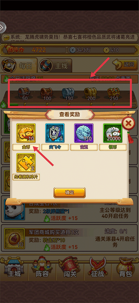 4、每日任务:玩家完成每日任务中的任务后可以获得活跃度,满足一定数量的活跃度后可以开启活跃度宝箱获取金币