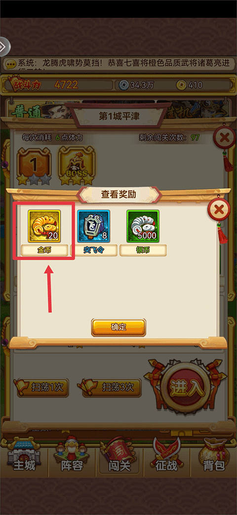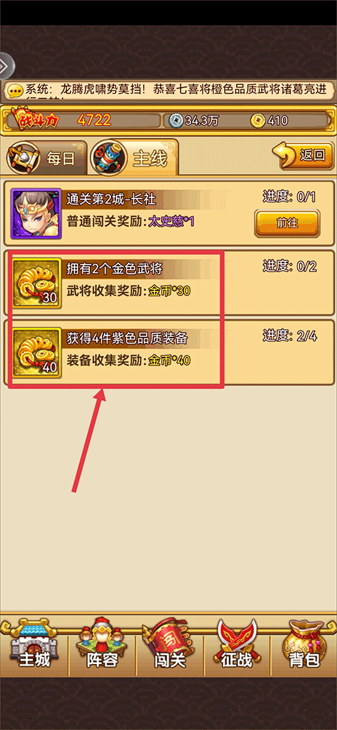 5、主线任务:主线任务中会有部分任务可以获得金币奖励,完成任务目标后即可领取