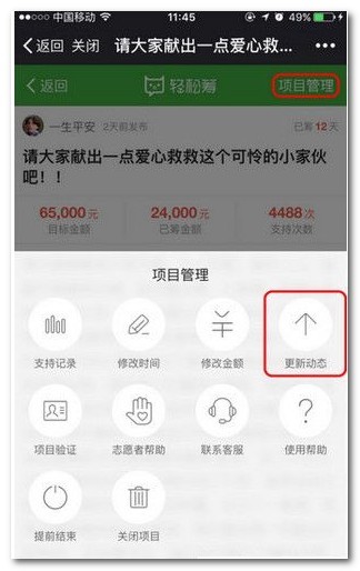 1、找到对应项目,点击「项目管理」,选择「更新动态」