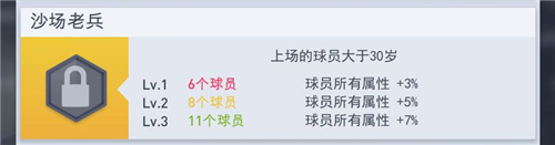 上场的球员大于30岁。6个球员:球员所有属性+3%;8个球员:球员所有属性+5%;11个球员:球员所有属性+7%。