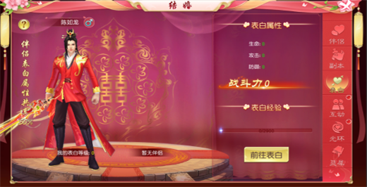 16.表白经验达到指定值后,会自动提升表白等级,增加人物属性。