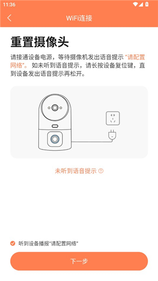 4、接通设备电源,等待设备发出语音提示,然后点击下一步