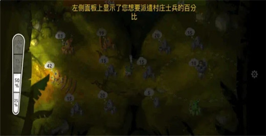 当首领拥有一定实力(人(菌)口)后,便可以调兵遣将向四周进行扩张。出征时,可以通过调节左侧的百分比进度条,选择不同建筑内想要派出的士兵数量比例(25%、50%、75、100%)