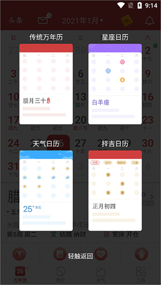 3、在点击一次,将会回到主界面,点击右侧的黄历,可以看到中国传统黄历