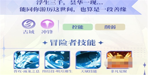 她的普通攻击叫做雨龙之息,通过雨滴对敌人造成伤害。天赋技能则可让她不断的恢复能量,如此就能更快地用出主动技能。三技能的话就可以让她觉醒能力,让她的攻击可以对敌人造成击退效果。带有一定的控制能力,并有效增强伤害。