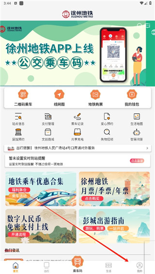 1、打开并登录app,进入首页,首页有热门资讯、站点信息、文创商城、展馆预约等功能,用户点击二维码乘车或下方乘车;